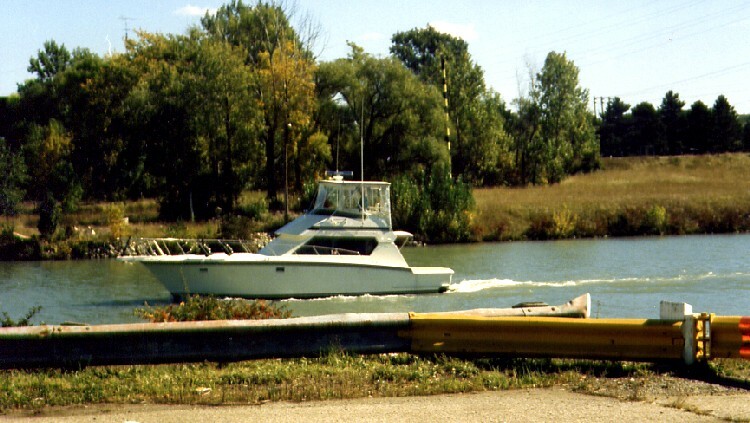Welland Ship Canal - cabin cruiser downbound at Bridge 5