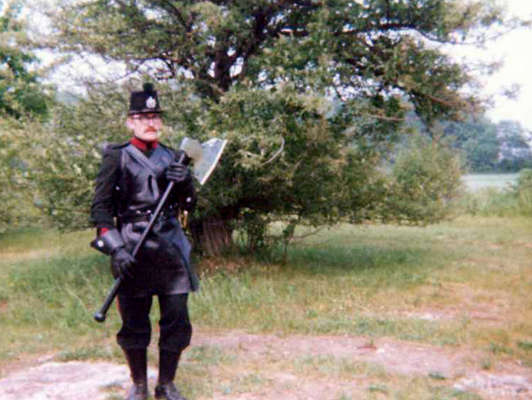 - Man wearing a replica military uniform carrying a battle axe