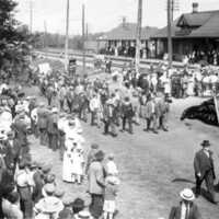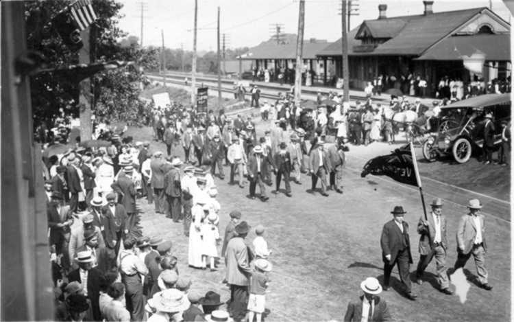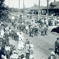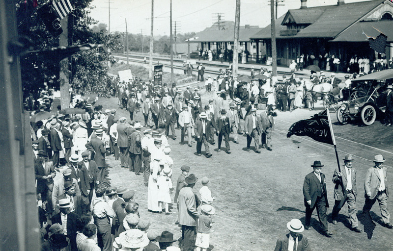 The Fenian Raid Veterans passing the M.C.R. [Michigan Central Railway] Station on Victoria Avenue