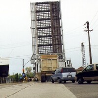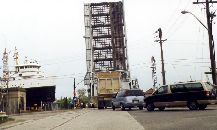 - Welland Ship Canal - Bridge #1 in upright position as upbound ship leaves lock 1