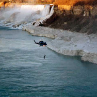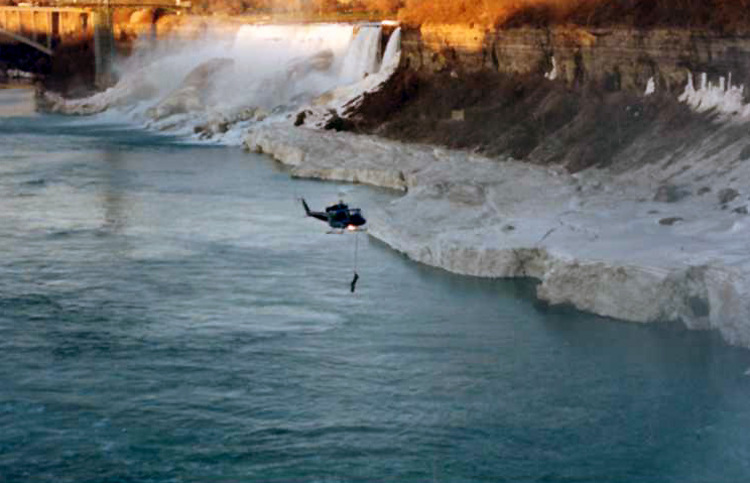 - Helicopter in the Gorge above the Niagara River during filming of the Movie "The Long Kiss Goodnight", American Falls and Rainbow Bridge in background