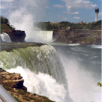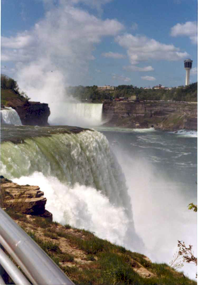 - American and Horseshoe Falls and the Minolta Tower from Prospect Point Niagara Falls New York