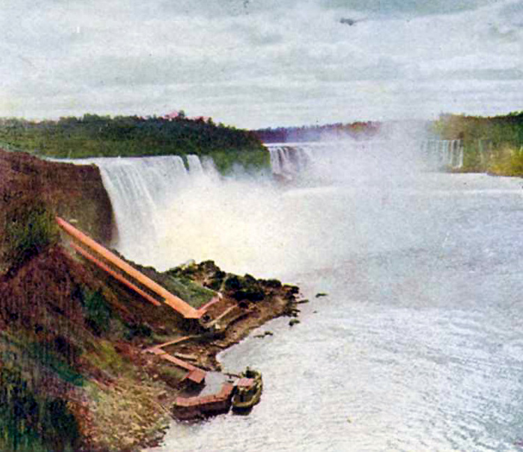 American and Horseshoe Falls and the Maid of the Mist landing dock on the American side. Incline Railway (left)