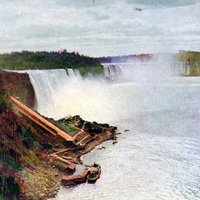 - American and Horseshoe Falls and the Maid of the Mist landing dock on the American side. Incline Railway (left)