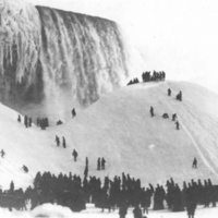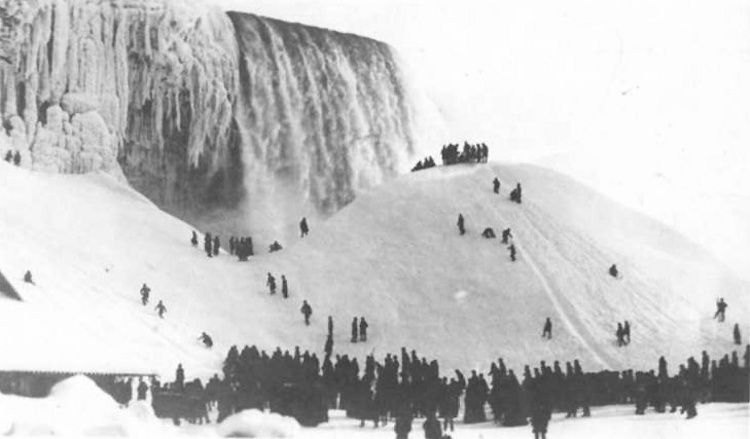 Visitors flock to the Ice Mountain in front of the frozen American Falls