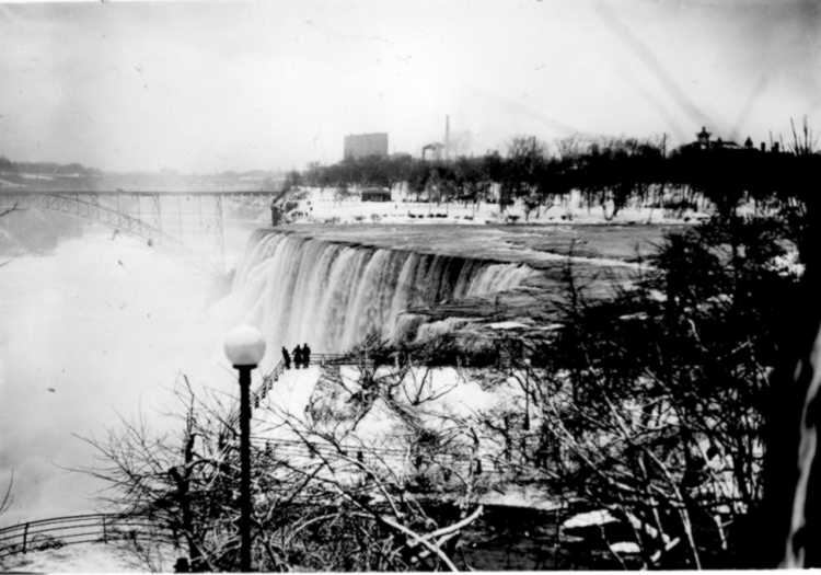 American and Bridal Falls as seen from Goat Island, Rainbow Bridge in background