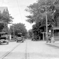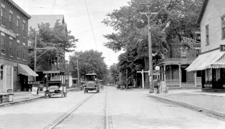 - en-CA The track down the middle of the street is for the old narrow guage trolley line that ran to Fort Niagara and Fort Niagara Beach (going north), and back to Niagara Falls (going south).