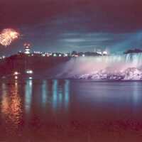 Night view showing fire works and the illuminated American Falls