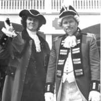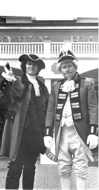 - Costumed actors standing in front of the Town Hall at Niagara-on-the-Lake