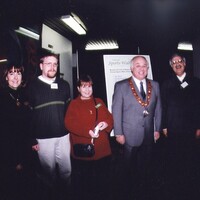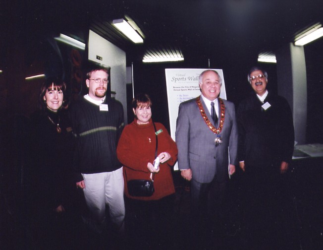 - L-R: Lori Albanese City of Niagara Falls Coordinator of the Ceremony, Chris Dunn Niagara Falls Public Library Information Systems, Janice Leak Niagara Falls Public Library Information Systems, Mayor Ted Salci, Chief Librarian Joe Longo