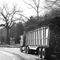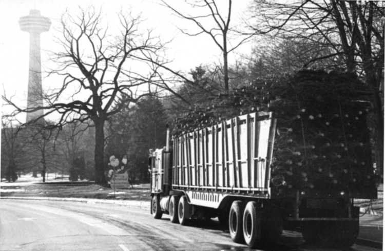 - Truck loaded with Christmas trees parked in Queen Victoria Park, Skylon Tower in background