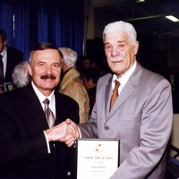- Doug Plummer being congratulated by Mayor Wayne Thomson (left)