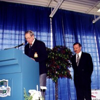 - at the podium making his acceptance speech, Mayor Wayne Thomson (right)