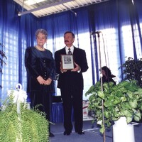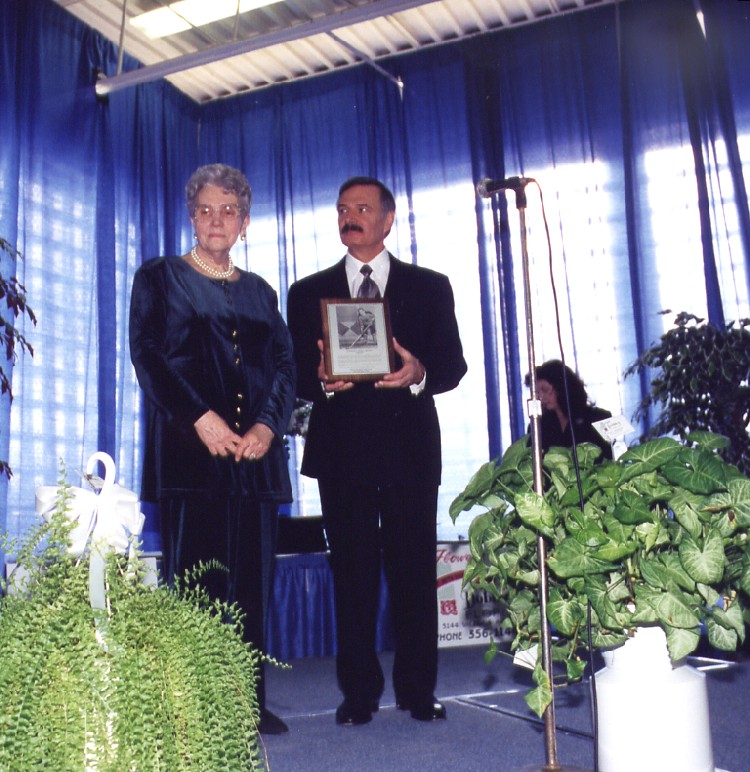 - Award being presented by Mayor Wayne Thomson (right) to Malcolm's wife, Muriel G. McEwan.