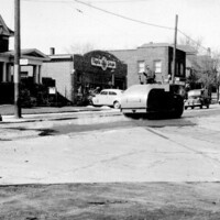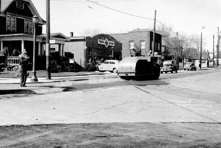 - steam roller belonging to City of Niagara Falls (foreground), Maple Leaf Grocers (centre background)