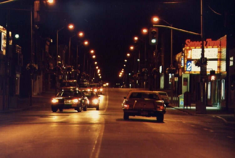 - Queen Street at night, Seneca Movie Theatre on right