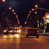 Queen Street at night, Seneca Movie Theatre on right