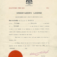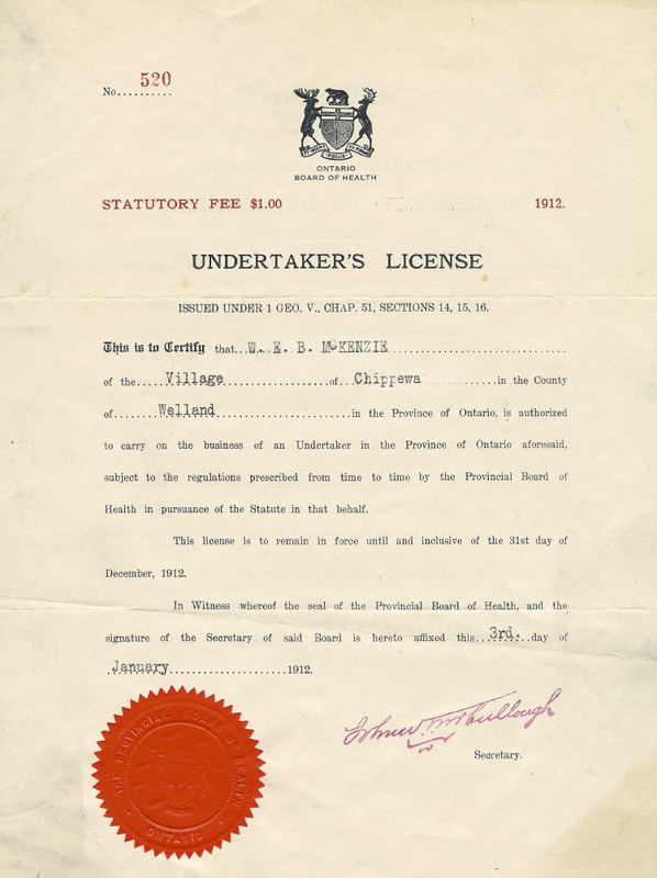 Undertaker's License issued to W E B McKenzie of the village of Chippawa