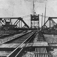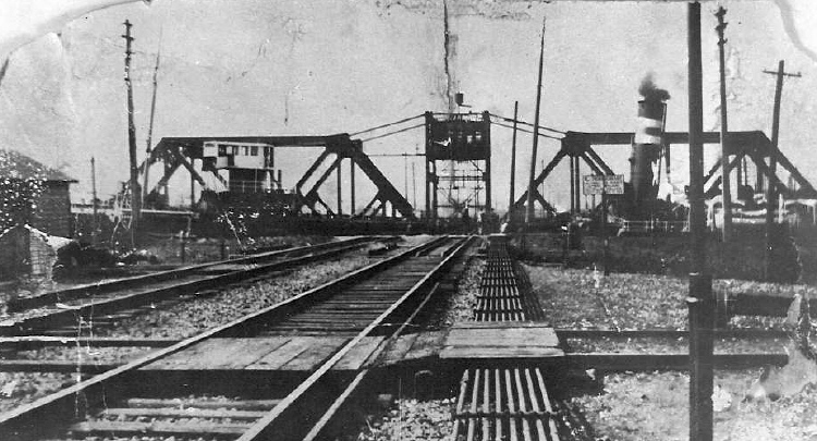 - en-CA There is a boat in the lock at the right, swing bridges fro CNR tracks crossing the canal .