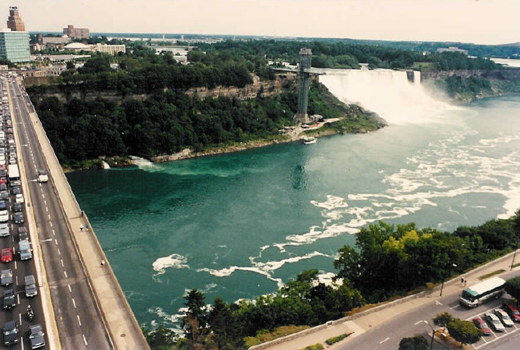 Rainbow Bridge, and the American Falls from the Carillon Tower, Facing Niagara Falls, New York