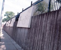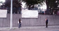 Spectators at the unveiling of the Lundy's Lane Battlefield Commemorative Wall John Harkness (middle) with two unidentified women at the ceremony for the unveiling of the Battle of Lundy's Lane Commemorative wall which depicts scenes from the Battle Of Lundy's Lane. In celebration of the City of Niagara Falls Centennial and the 190th Anniversary of the Battle of Lundy's Lane, fought July 25, 1814, these limestone panels were created to pay tribute to those whose lost their lives in the battle. Panels were created by Campbell Monument Company of Belleville. Erected July 25, 2004 by his Worship Mayor Ted Salci and members of the City of Niagara Falls Municipal Council. -