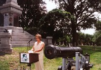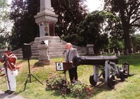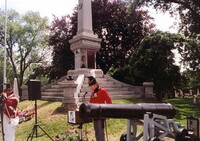 Ceremony for the unveiling of the Lundy's Lane Battlefield Commemorative Wall Kevin Windsor, dressed as a soldier speaking at podium at the unveiling of the Battle of Lundy's Lane Commemorative wall which depicts scenes from the Battle Of Lundy's Lane. In celebration of the City of Niagara Falls Centennial and the 190th Anniversary of the Battle of Lundy's Lane, fought July 25, 1814, these limestone panels were created to pay tribute to those whose lost their lives in the battle. Panels were created by Campbell Monument Company of Belleville. Erected July 25, 2004 by his Worship Mayor Ted Salci and members of the City of Niagara Falls Municipal Council. -