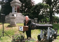 Ceremony for the unveiling of the Lundy's Lane Battlefield Commemorative Wall Mayor Ted Salci speaking at podium at the unveiling of the Battle of Lundy's Lane Commemorative wall which depicts scenes from the Battle Of Lundy's Lane. In celebration of the City of Niagara Falls Centennial and the 190th Anniversary of the Battle of Lundy's Lane, fought July 25, 1814, these limestone panels were created to pay tribute to those whose lost their lives in the battle. Panels were created by Campbell Monument Company of Belleville. Erected July 25, 2004 by his Worship Mayor Ted Salci and members of the City of Niagara Falls Municipal Council. -