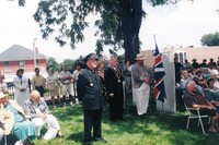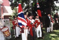Ceremony for the unveiling of the Lundy's Lane Battlefield Commemorative Wall Contingent of soldiers in military uniform bearing flags at the unveiling of the Battle of Lundy's Lane Commemorative wall which depicts scenes from the Battle Of Lundy's Lane. In celebration of the City of Niagara Falls Centennial and the 190th Anniversary of the Battle of Lundy's Lane, fought July 25, 1814, these limestone panels were created to pay tribute to those whose lost their lives in the battle. Panels were created by Campbell Monument Company of Belleville. Erected July 25, 2004 by his Worship Mayor Ted Salci and members of the City of Niagara Falls Municipal Council. -