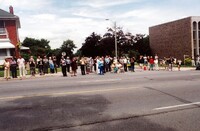 Ceremony for the unveiling of the Lundy's Lane Battlefield Commemorative Wall Spectators at the unveiling of the Battle of Lundy's Lane Commemorative Wall which depicts scenes from the Battle of Lundy's Lane. In celebration of the City of Niagara Falls Centennial and the 190th Anniversary of the Battle of Lundy's Lane, fought July 25, 1814. These limestone panels were created to pay tribute to those whose lost their lives in the battle. Panels were created by Campbell Monument Company of Belleville. Erected July 25, 2004 by his Worship Mayor Ted Salci and members of the City of Niagara Falls Municipal Council. -