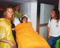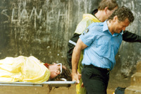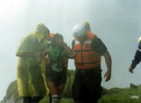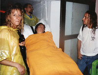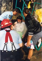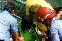 Lori Martin assisted by emergency workers after she & Steven Trotter went over the Falls in a barrel STEVE FIRE POLICE NIAGARA PARKS POLICE -