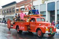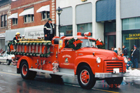 Fire truck from Willoughby in the Santa Claus Parade location Queen Street ; Big Sisters office (left) , Classy Lady Fashions (centre) ; Royal Bank of Canada (right) ; -