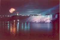 Night view showing fire works and the illuminated American Falls 200th Birthday Celebration : America's first Bicentennial City -