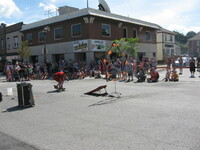 Buskerfest 2012 Fire Guy balances on a skateboard about to jump through a ring of fire at the intersection of Queen St. and St. Clair Ave. The former CJRN building is visible in the background. -