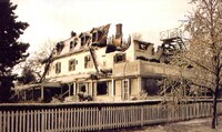 An old historical residence Chippewa sic [Chippawa] Ont [Ontario] A large stone house ; central steps leading up to main porch with four large pillars ; side porch and verandah to the left ; out buildings to the right ; this view is as it appeared in the mid 1920s when it was known as Old Manor Camp ; -