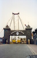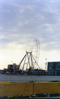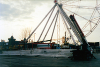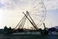 Maple Leaf Village Ferris Wheel being dismantled The ferris wheel at Maple Leaf Village being torn down in the fall/winter of 1992 ; about sixty percent of the wheel has been removed ; heavy construction crane partially visible in background centre right between the steel girders of the wheel ; sign on crane reads "J J Equip" ; man in cherry picker attached to crane (right) ; Maple Leaf Village logo sill attached to pole at top of ferris wheel ; red green and white building in background on Victoria Avenue advertising "Pizzas and Pasta" ; steel girders already removed from wheel piled in foreground of image ; entrance gate towers in background (left) ; -