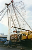 Maple Leaf Village Ferris Wheel being dismantled The ferris wheel at Maple Leaf Village being torn down in the fall/winter of 1992 ; about sixty percent of the wheel has been removed ; heavy construction crane partially visible in centre between the steel girders of the wheel ; man in cherry picker attached to crane (centre) ; Maple Leaf Village logo sill attached to pole at top of ferris wheel ; -