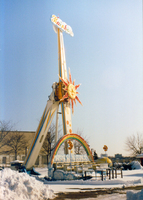 The Rainbow ride at Maple Leaf Village Amusement Park Tall and narrow steel structure ; Sign on very top reads "Rainbow" ; a large sun face is located about a third of the way down the structure ; a rainbow arches around the bottom of the ride ; snow on ground ; -