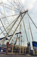 Maple Leaf Village Ferris Wheel being dismantled The ferris wheel at Maple Leaf Village being torn down in the fall/winter of 1992 ; about seventy five percent of the wheel has been removed ; heavy construction crane partially visible in background centre right between the steel girders of the wheel ; sign on crane reads "J J Equip" ; man in cherry picker attached to crane (right) ; Maple Leaf Village logo sill attached to pole at top of ferris wheel ; red green and white building in background on Victoria Avenue advertising "Pizzas and Pasta" ; steel girders already removed from wheel piled in foreground of image ; entrance gate towers in background (left) ; -