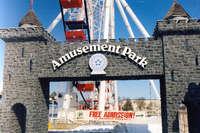 Maple Leaf Village Amusement Park and Mall Entrance The entrance is comprised of two stone towers connected by a crenallted stone wall ; Sign on the connecting wall reads "Amusement Park: ; sign visible through entrance reads "Free admission to amusement park & mall" ; the ferris wheel is directly behind the entrance ; ride cars visible above the entrance ; snow on ground ; -