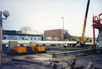 Maple Leaf Village demolished The amusement park totally demolished ; construction equipment crane (right) buildings in background on Victoria Avenue ; R-L: Hampton Inn, Chinese restaurant ; Pizza and pasta restaurant ; steel girder from the base of the ferris wheel across image ; tower structure (centre right) is sign for Maple Leaf Village parking ; -