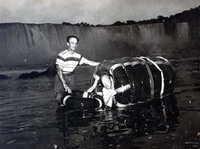 George L. Stathakis Death Barrel Lodged behind rocks at base of Falls 22 hours. When opened the man was found suffocated to death. On display at Niagara daredevil Gallery.
