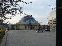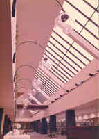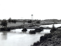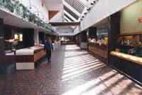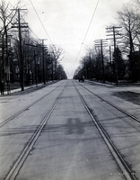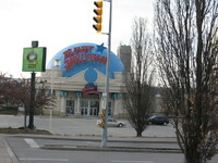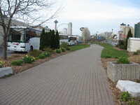 Pedestrian Walkway along the path of the old Canadian Pacific Railway Tracks along Victoria Avenue. In the background the giant ferris wheel, the Skylon Tower and various hotels can be seen.