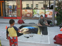 Buskerfest 2012 A street artist and his sidewalk painting. Queen Street, south side, across from Queen Street Pharmacy. -