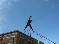 Buskerfest 2012 Acrobat Reuben Dot Dot Dot performing on a pole at the intersection of Queen Street and St. Clair Avenue. The building at 4481 Queen Street is visible in the background. -