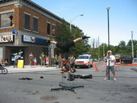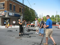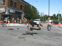 Buskerfest 2012 Volunteers assisting acrobat Reuben Dot Dot Dot in setting up a pole at the intersection of Queen Street and St. Clair Avenue. 4481 Queen Street building visible in the background. -