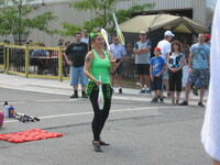 Buskerfest 2012 A juggler performs at the intersection of Queen Street and St. Lawrence Avenue. The patio of Q Street Pizza is visible in the background. -