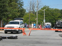 Buskerfest 2012 Performers at the intersection of Queen Street and St. Lawrence Avenue. Q Street Pizza is visible in the background. -