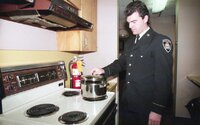Lee Smith Fire Prevention officer. Putting a pot lid on pot as a first stage of fire prevention