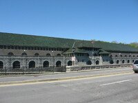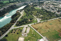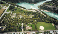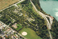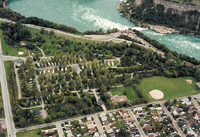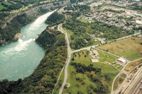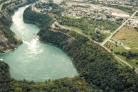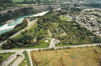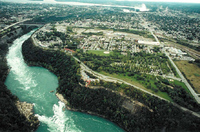 View of the lower Niagara River, Minolta Tower, Emassy Suites hotel, Niagara Fallsview casino Complex, Skylon Tower, Imax Theatre and Ontario Power Generating station at the water's edge taken from a balloon. Balloon Ride - Flight of Angels, Niagara Falls, New York