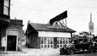 A large stone house ; central steps leading up to main porch with four large pillars ; side porch and verandah to the left ; out buildings to the right ; this view is as it appeared in the mid 1920s when it was known as Old Manor Camp ;